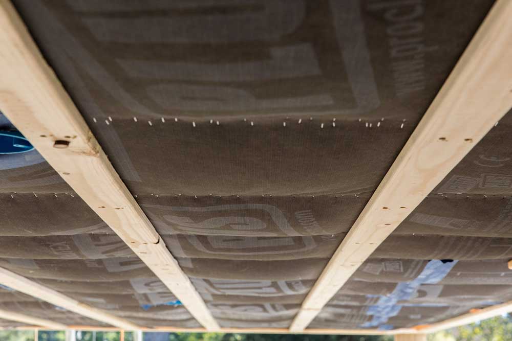 We insulated the double stud walls with 12″ of cellulose insulation protected by the Intello membrane for an R42 wall. We also air-sealed the attic and blew 22″ of cellulose on the attic floor for an R74. The radiant heated floor (an overhang ceiling) is dense-packed with 10″ of cellulose covered with a Solitex vapor smart membrane for an R35. This addition is so well insulated, it costs the homeowner next to nothing to heat and cool it . The complete thermal boundary of insulation provides amazing sound-deadening and will manage moisture, never grow mold and last for the life of the structure as it protects the home from outside elements as well as fire.
